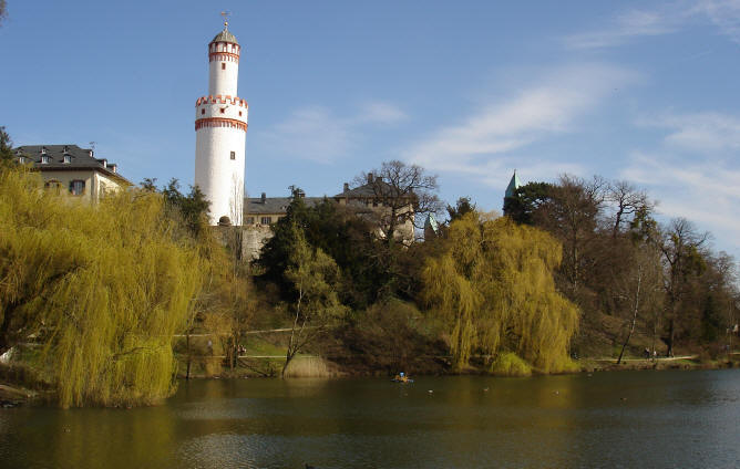 Blick auf den Schloßpark von Bad Homburg mit Teich und Weißem Turm