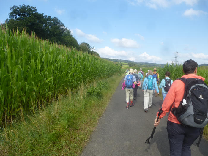 Usinger Wanderer im Salzboedetal vorbei an hohen Maisfeldern